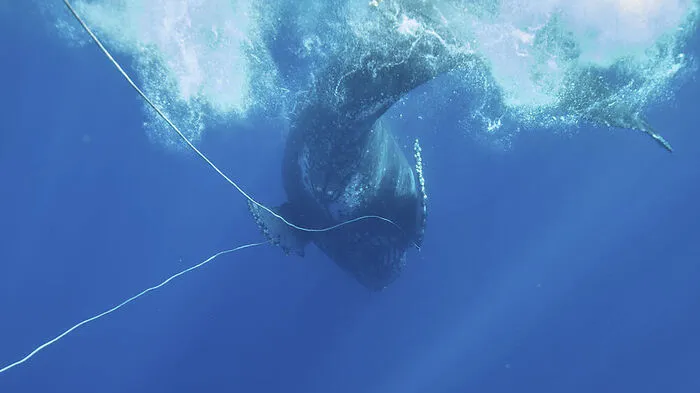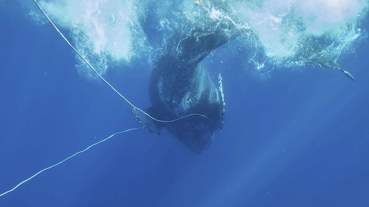 Einen in fast 90 Meter Schnur verwickelten ausgewachsenen Buckelwal haben Rettungskräfte vor der hawaiianischen Insel Maui befreit.