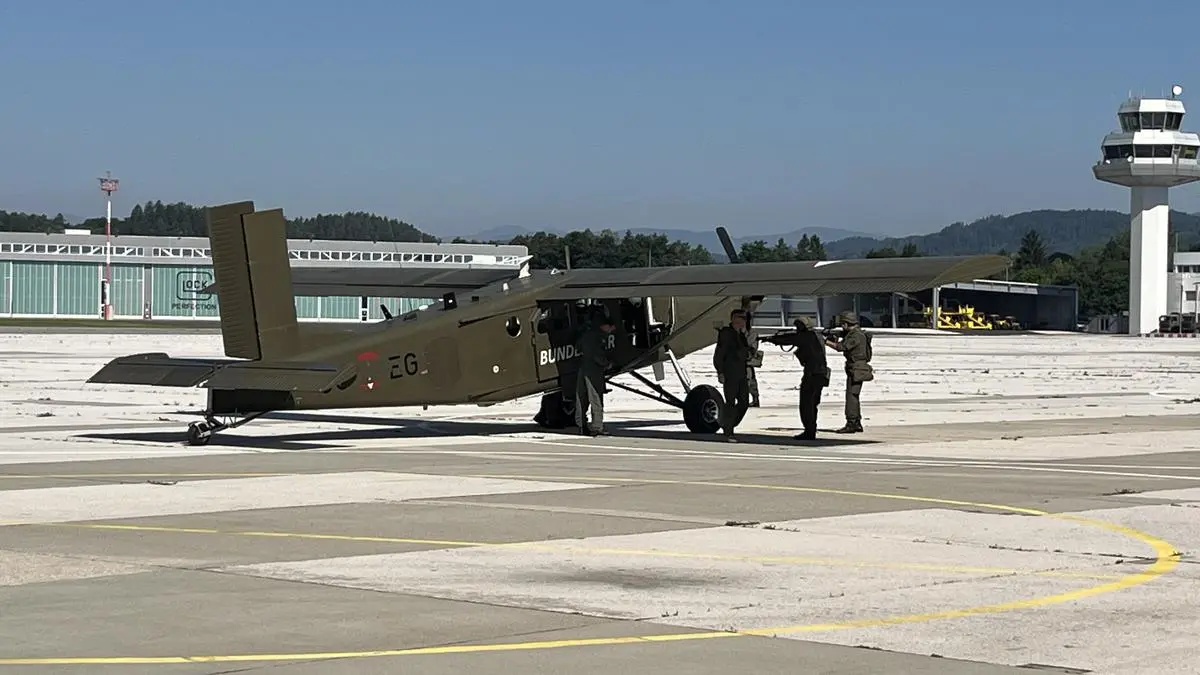 Eine dunkelgrüne Propellermaschine fliegt über dem Flughafen, zwei Eurofighter verfolgen sie. Die Spitzen der Kampfjets stehen fast senkrecht nach oben, damit sie die niedrige Geschwindigkeit der Propellermaschine überhaupt erreichen können. Mit ohrenbetäubendem Lärm ziehen sie dann immer wieder Kreise um das Flugzeug. Zwingen es schlussendlich zur Landung und drehen ab. „Hätten sie sich geweigert, dann wäre das Flugzeug beschossen worden“, sagt Enenkel.