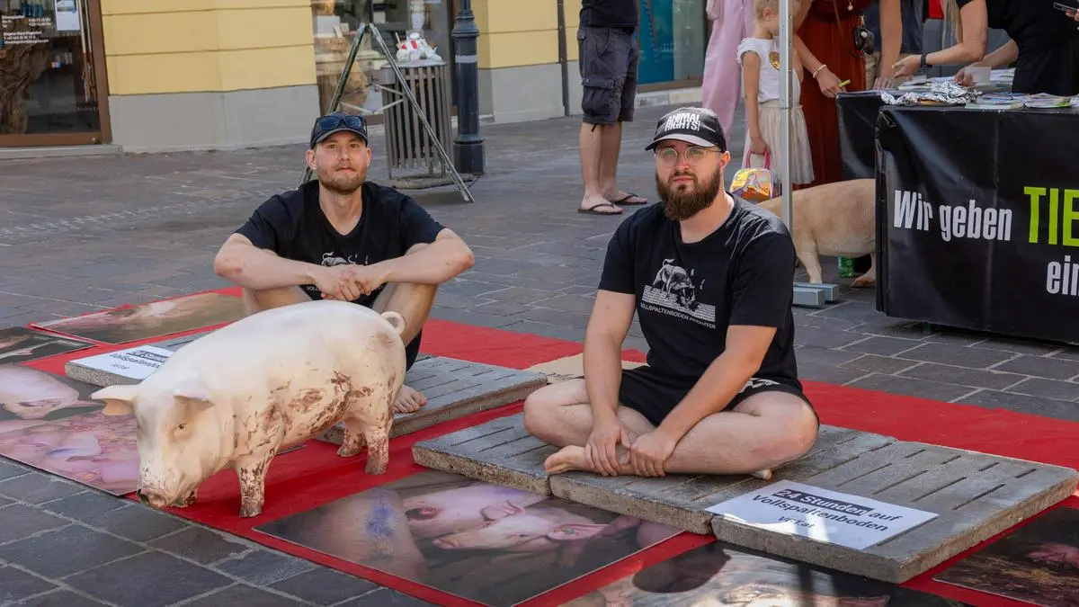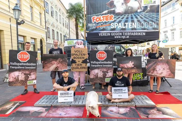 Um auf diese Umstände aufmerksam zu machen, verbringen zwei Tierschützer 24 Stunden auf Vollspaltenböden in der Klagenfurter Innenstadt. Von Samstag, 9 Uhr, bis Sonntag, 9 Uhr, sitzen und liegen die Männer auf dem Beton vor der Pestsäule auf dem Alten Platz.