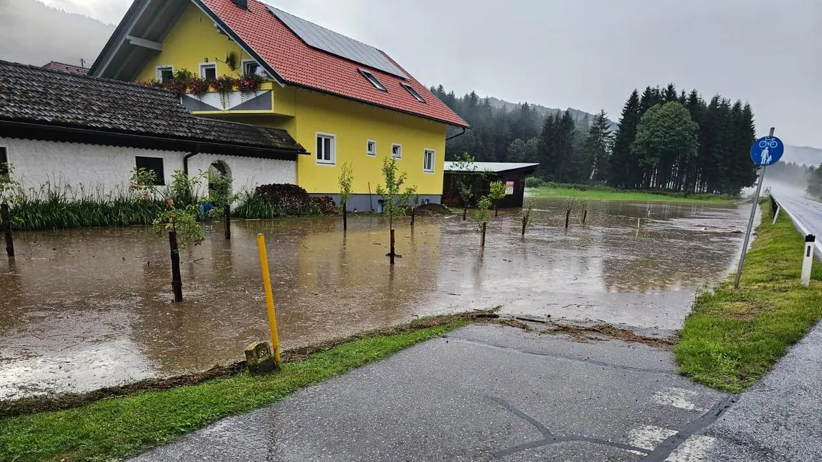 Mehrere Wohnhäuser und eine Tischlerei. „Wir wurden eigentlich wegen steckengebliebener Pkw alarmiert. Der über die Ufer getretene Bach bedrohte aber rasch auch die Wohnhäuser“, erklärt Jürgen Gräßl, Abschnittsfeuerwehrkommandant Oberes Lavanttal. Bald darauf trat ein weiterer Bach im Gemeindegebiet über die Ufer, auch dort wurde ein weiteres Haus überflutet.