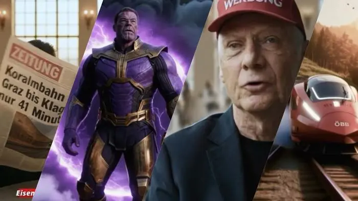 Auf dem Instagram-Account al_pigeone ist seit wenigen Tagen ein Reel online, das mit herrlicher Absurdität sowie unzähligen Film- und historischen Referenzen den Koralmtunnel feiert. Zu sehen: Bundespräsident Alexander Van der Bellen im Kostüm des „Iron Man“, ÖBB-Ceo Andreas Matthä als Nick Fury, Chef der Avengers, also einer US-Superheldentruppe sowie die verstorbenen Austro-Legenden Falco und Niki Lauda. Letzterer mit dem typischen roten Kapperl und einem freigehaltenen Werbeplatz. Auch Kaiserin Sisi hat ihre Rolle in dem freilich nicht ganz ernst gemeinten Trailer. Und als man schon dabei war, Tote wieder zu erwecken, ließ man auch Jörg Haider auferstehen und packte ihn ebenfalls in eine Superheldenrüstung - als Kampfgegner von Van der Bellen. Dass sich der ehemalige Grüne-Politiker und der verstorbene Kärntner Landeshauptmann inhaltlich in dieser Frage durchaus nahe waren, sei nur der Vollständigkeit wegen erwähnt.