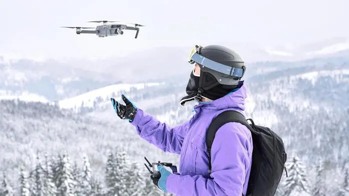 Frau mit Skihelm und Drohne in Winterlandschaft | Eine Drohne kann zur Gefahr werden: Wer haftet bei einem Unfall?