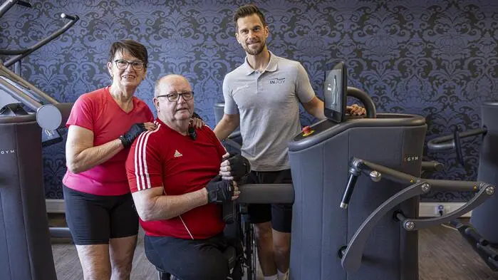 Das Training selbst ist mehr als eine Beschäftigungstherapie. Die Kraft im Oberkörper hilft im Alltag. „Das ist extrem wichtig für mich. Ich muss mich ja noch lange selbstständig ins Bett oder ins Auto hieven können“, sagt der zweifache Großvater, der auch weiß, dass die Situation nicht nur ihm, sondern auch Ehefrau Maria viel abverlangt. „Er war vorher auch ein fester Radfahrer. 1,86 groß und 83 Kilo schwer. Und er ist einfach auch ein Realist“, erzählt sie über den Mann, mit dem sie heuer den 50. Hochzeitstag feiert. „Wir zwei schaffen das miteinander“, sagen die beiden, die immer gemeinsam ins Studio kommen.