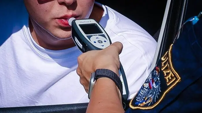 Man sieht einen Polizisten, der einen Mann in einen Alkomaten blasen lässt | Insgesamt 13 Führerscheine wurden wegen Alkohol, vier weitere wegen Drogen hinterm Steuer abgenommen