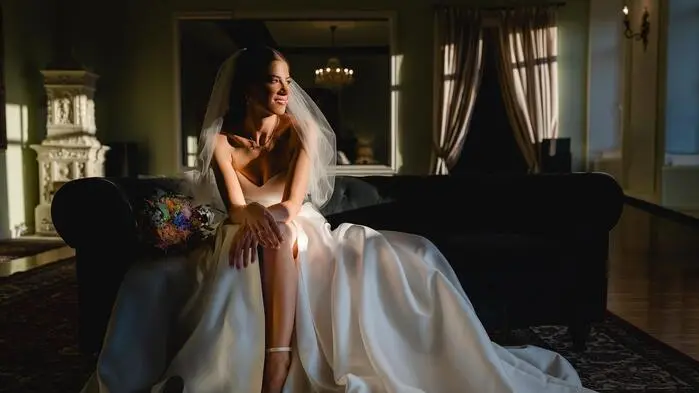 Eine Braut sitzt im Halbschatten