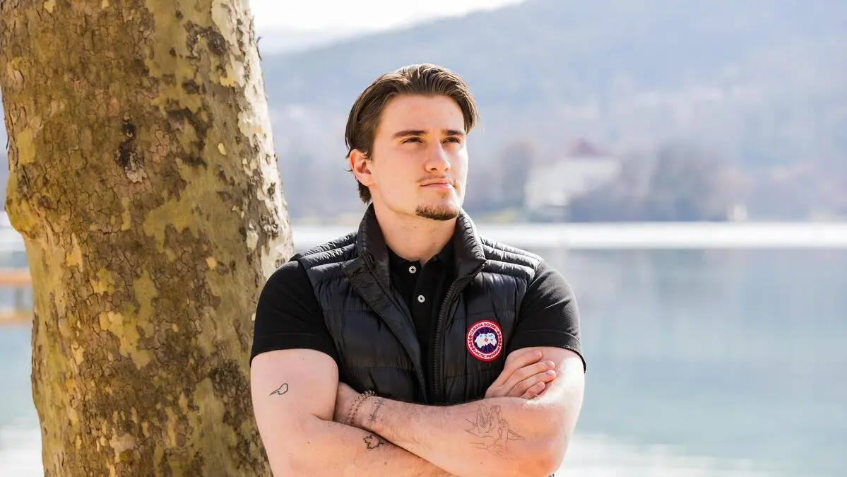Man sieht einen jungen Mann mit verschränkten Armen in die Ferne blicken, im Hintergrund ist der Wörthersee