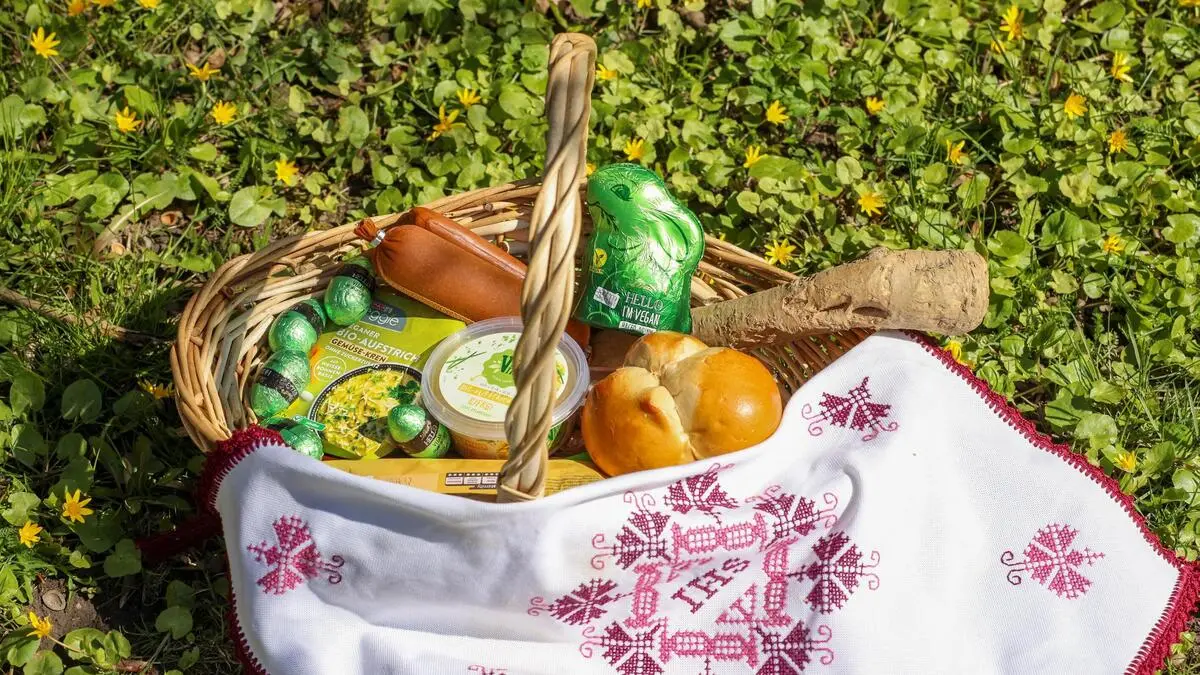 Für einen gut gefüllten veganen Osterkorb mit Pinzen, Fleischersatz und Schokolade werden rund 40 Euro fällig
