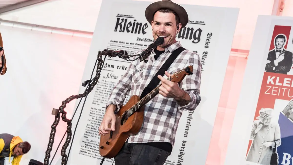 Ein Mann mit Hut und Gitarre auf der Bühne