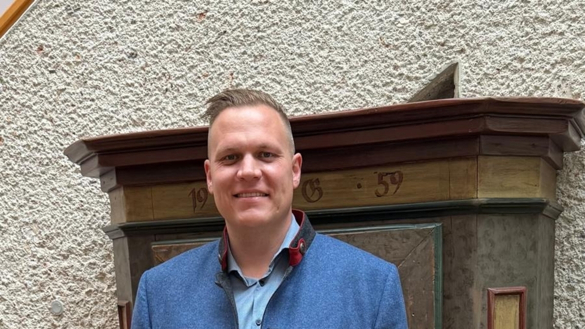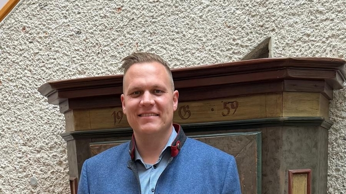 Man sieht einen Mann im Trachtensakko vor einem alten Möbelstück stehen