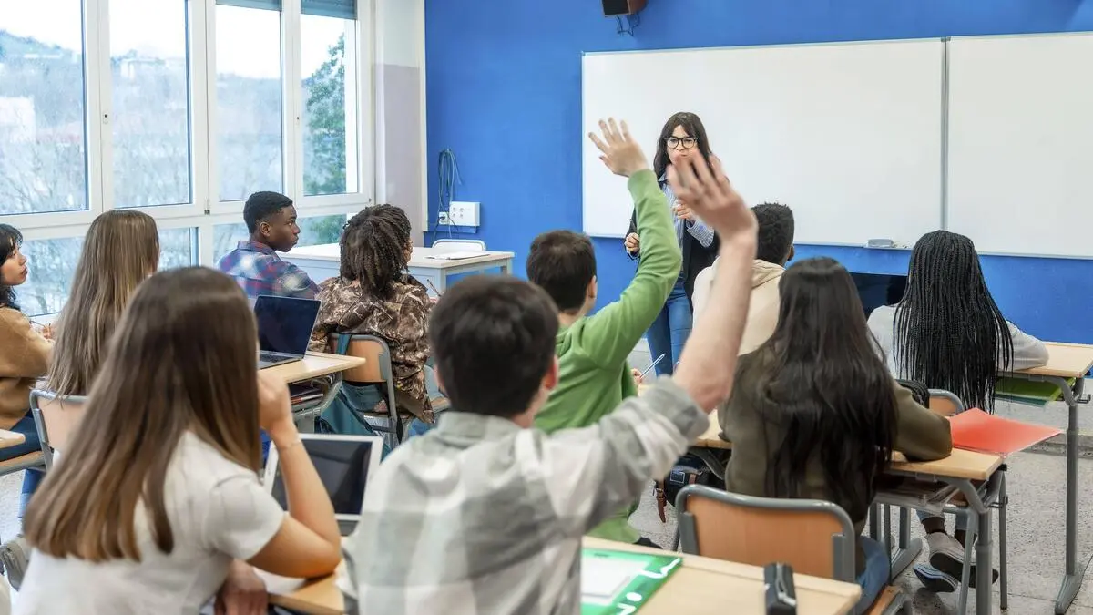Ein Lehrer steht in einer Schulklasse vor einer Tafel, vor ihm sitzen Schüler