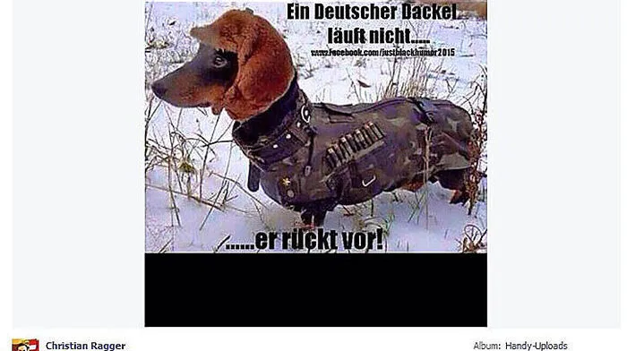 Ein Facebook-Posting von FPÖ-Landesrat Ragger löst Kopfschüttelbn aus. "Ein deutscher Dackel läuft nicht, er rückt vor", postet Ragger. Und auf einem Foto zu sehen: ein Dackel in einschlägiger Montur.