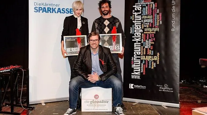 „Herkules“-Organisator Mario Kuttnig umrahmt von den Siegern des Klagenfurter Kleinkunstpreises 2016: Lisa Eckhart und Marcel Mohab