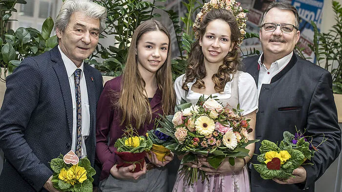 Gerhard Wastl (LWK-Obmann der Gärntner), Kleine-Schnupperpraktikantin Valentina Harisch, "Valentina" Franzi Mayer und Kurt Glantschnig (WK-Innungsmeister Gärtner und Floristen)