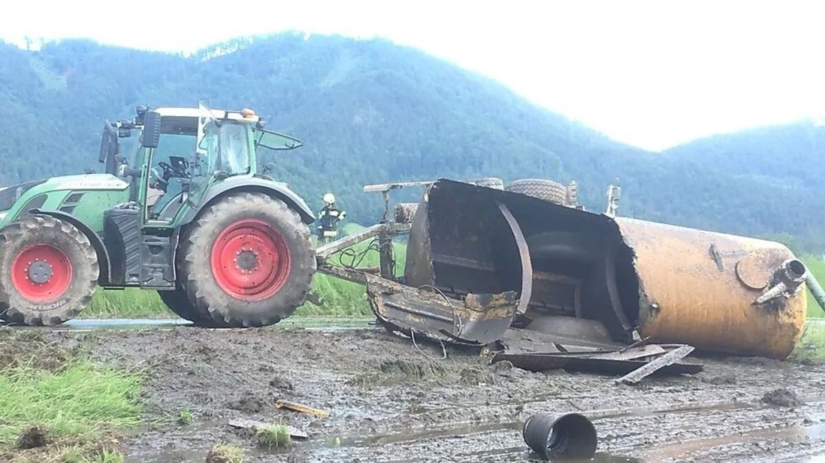 Das stinkt zum Himmel! Weil ein Auto einen Traktor zu knapp überholt hat, kippte der Traktor-Anhänger mit Jauche um. Die Gülle verteilte sich Großteils auf einen Acker, der an die Straße grenzt.