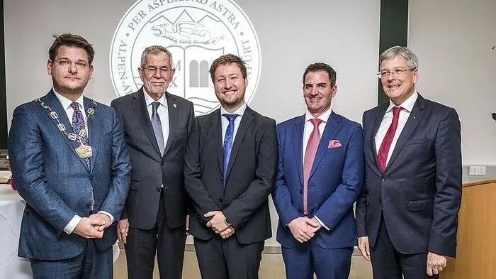 Rektor Oliver Vitouch, Bundespräsident Alexander van der Bellen, die beiden Doktoren Hackl und Niemetz sowie Landeshauptmann Peter Kaiser