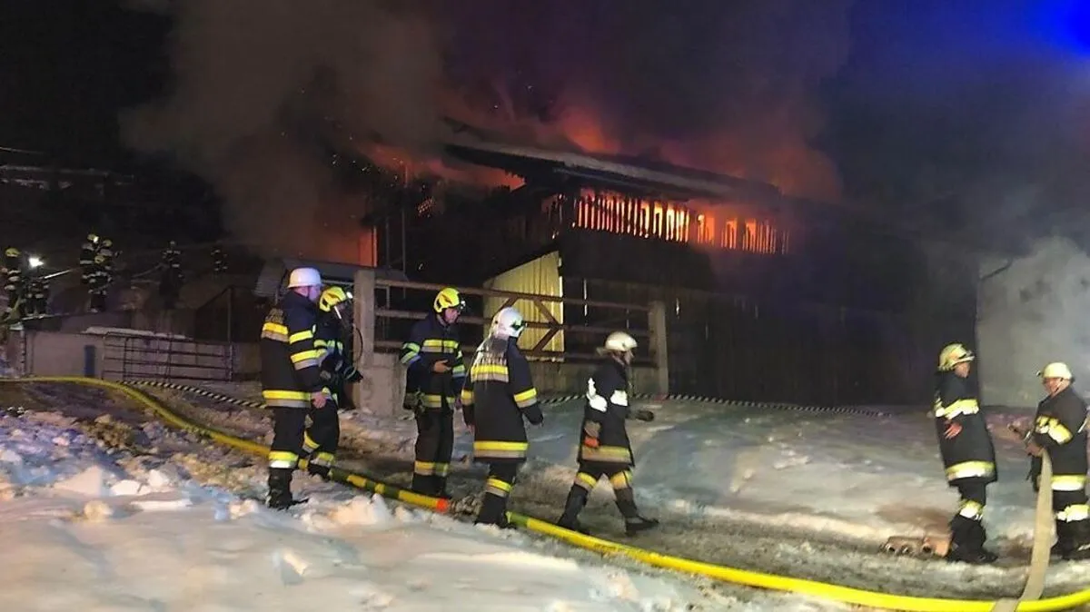 Ein Stall in Dellach im Drautal ist Donnerstagabend völlig abgebrannt. Der Bauer konnte 20 Jungrinder selbst aus den Flammen befreien. 110 Einsatzkräfte kämpften mit schwierigen Bedingungen.