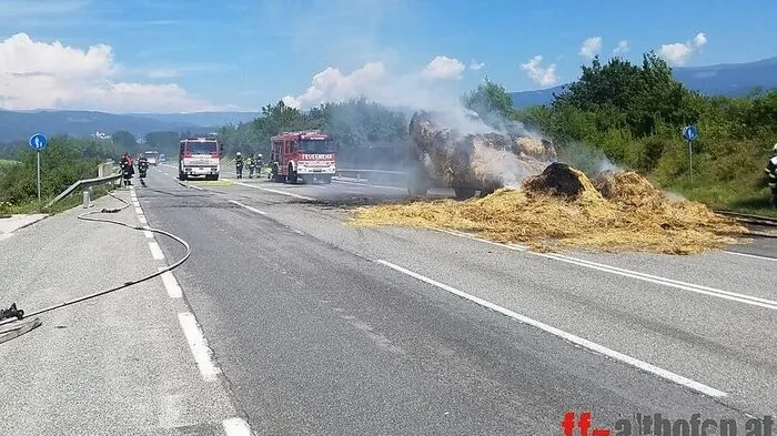 Traktoranhänger mit Stroh fing mitten auf der Straße Feuer