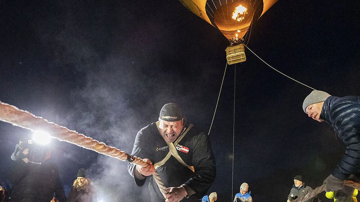 Der Kärntner Martin Hoi hat schon Schiffe, Busse und Straßenbahnen gezogen. In Filzmoos holte er am Dienstag einen Heißluftballon vom Himmel. Nur mit seiner eigenen Muskelkraft zog er den 4500 Kubikmeter großen Ballon nach unten.