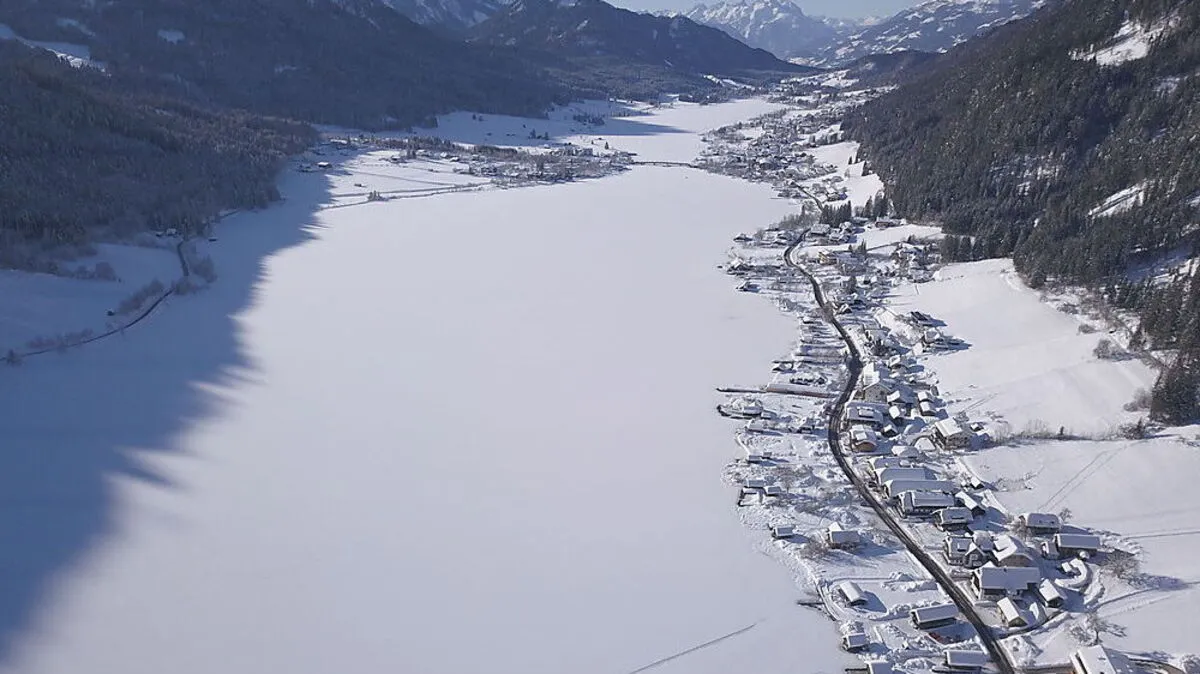 Eine aktuelle Luftaufnahme vom schneebedeckten Weißensee. „Es dringt keine Kälte zum Eis durch“