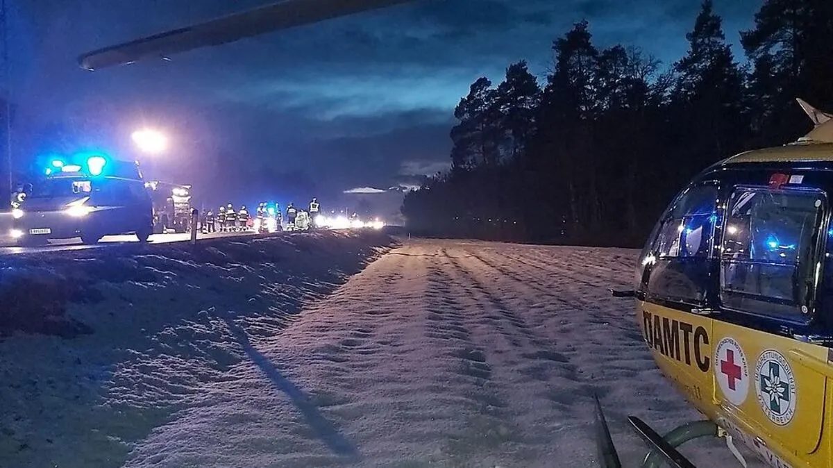 Schwerer Verkehrsunfall Freitagabend auf der B70 bei Grafenstein. Auch der Rettungshubschrauber Christophorus 11 stand im Einsatz.