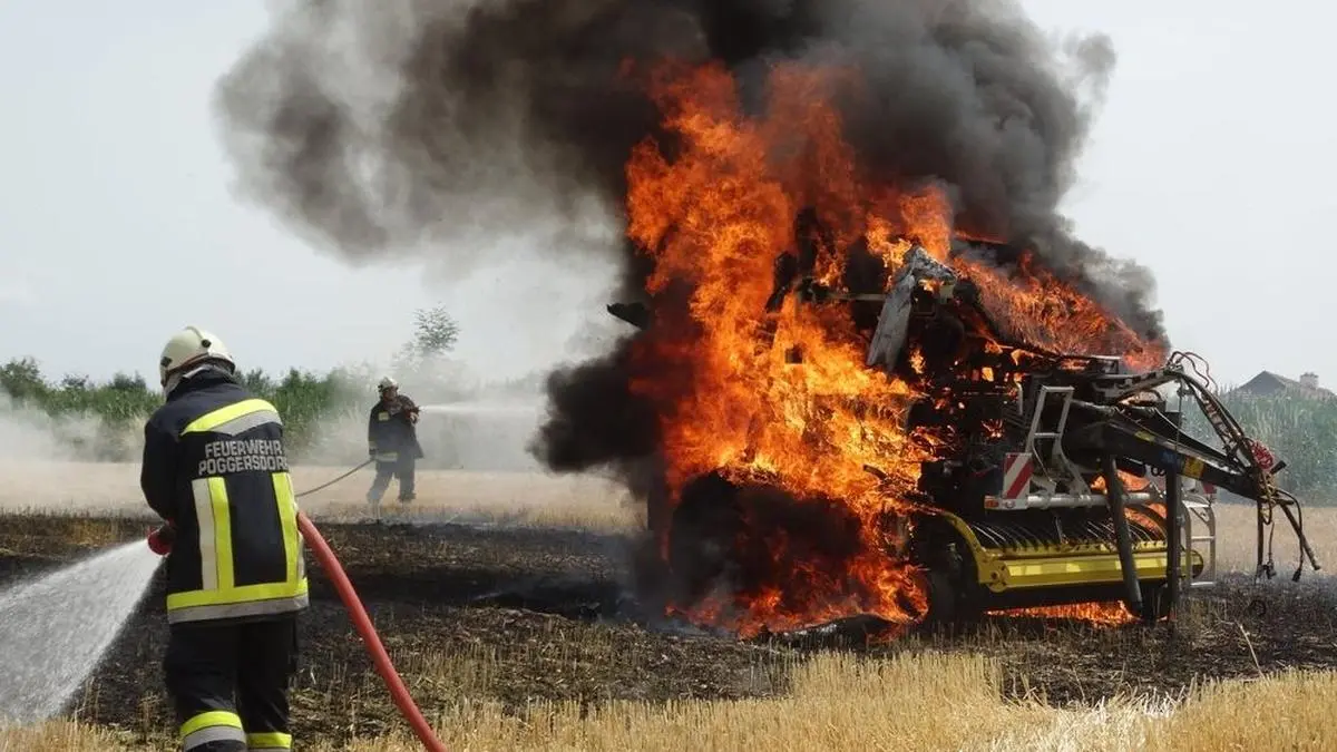 Ein 28-jähriger Landwirt war am Dienstag gegen 13.15 Uhr in Poggersdorf auf einem Acker mit dem Pressen vom Stroh beschäftigt. Währenddessen nahm er aufsteigenden Rauch bei der am Traktor angehängten Rundballenpresse wahr. Der 28-Jährige brachte das Fahrzeug sofort zu Stillstand, wobei zu diesem Zeitpunkt bereits Flammen aus der Rundballenpresse aufstiegen. Der Landwirt koppelte die brennende Rundballenpresse noch am Acker vom Traktor ab, stellte diesen ca. 30 Meter entfernt ab und verständigte sofort über Notruf die Feuerwehr.