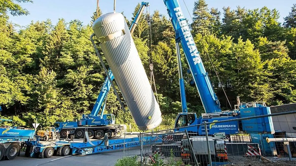 Das Projekt eines neuen Pufferspeichers in Villach-Warmbad läuft auf Hochtouren. Am Donnerstag wurden die tonnenschweren Stahl-Druckbehälter beim Heizwerk montiert.