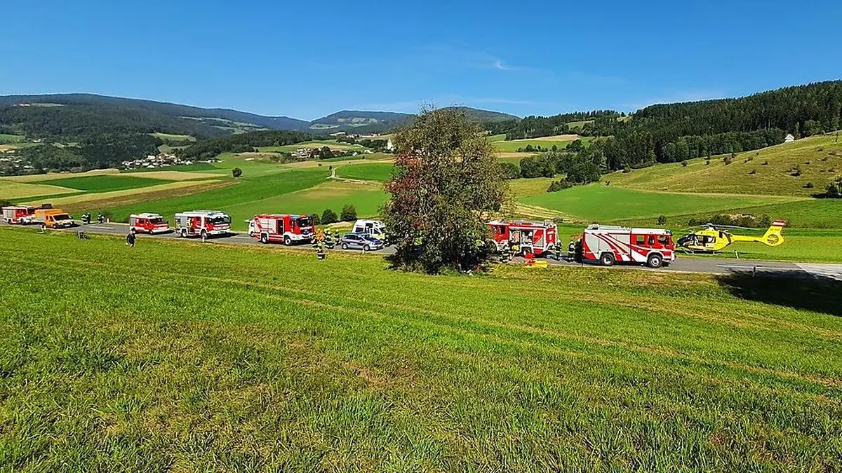 Großeinsatz für die Rettungskräfte Freitagvormittag auf der Silberegger Straße L 82 bei Guttaring. Kurz vor 10.45 Uhr war dort im Bereich Schelmberg ein Pkw aus bisher unbekannter Ursache von der Fahrbahn abgekommen und frontal gegen einen Baum geprallt.