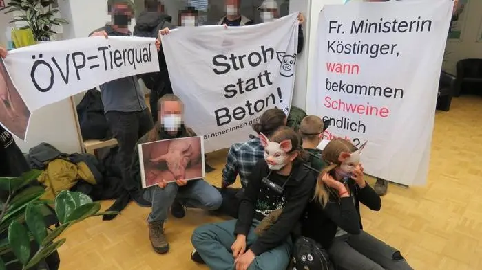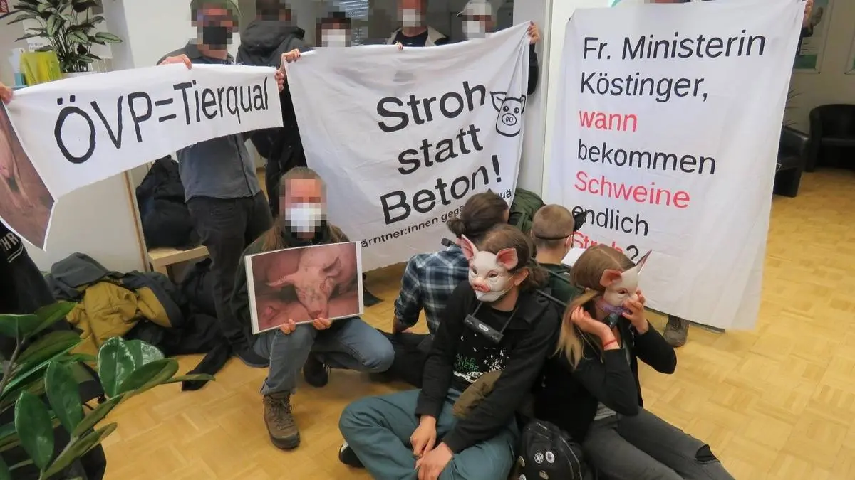 Aktivisten besetzten Kärntens ÖVP-Parteizentrale, weil sie das Gespräch mit Landwirtschaftsministerin Köstinger suchten. Das Ministerium entgegnet: Die Zuständigkeit liege bei Tierschutzminister Rauch.