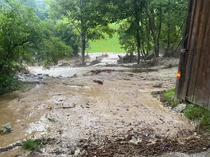 Plötzlich kommen die Wassermassen mit Geröll und Holz: