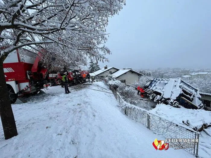 Ein Müllentsorgungs-Lkw fuhr um 5.30 Uhr bei schneebedeckter Fahrbahn auf der L 10 (Trebesinger Landesstraße) im Ortsgebiet von Spittal/Drau bergab Richtung Ortszentrum. Dabei kam der Lkw ins Rutschen, von der Fahrbahn ab, fuhr über ein Garagendach und blieb seitlich am Zaun vor einem steil abfallenden Grundstück hängen.
