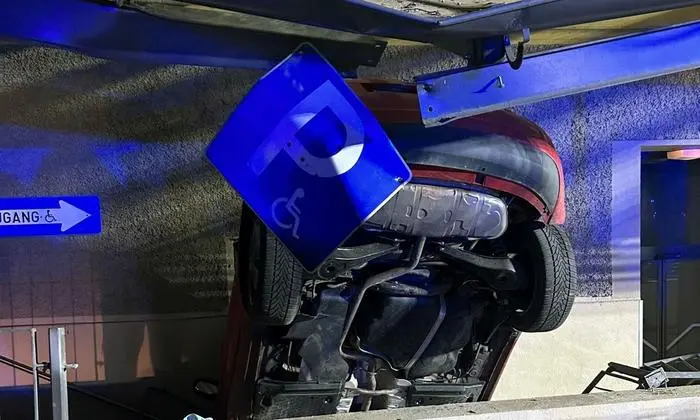 Die 16-jährige Spanierin, natürlich ohne Führerschein, verwechselte aber Gas mit Bremse und fuhr über den Treppenabgang eines Gebäudes. Sie durchbrach dabei die Umzäunung und krachte in das Gebäude. Umzäunung, Fassade und die Überdachung wurden schwer beschädigt.
