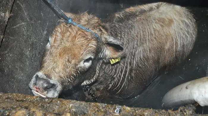 Vermutlich durch das Herumtrampeln der Tiere vor dem geschlossenen Auslauftor verrutschten die hölzernen Abdeckpfosten der dortigen Güllegrube, woraufhin ein Kalb in die über drei Meter tiefe Grube, die zu zwei Dritteln mit Gülle gefüllt war, stürzte.