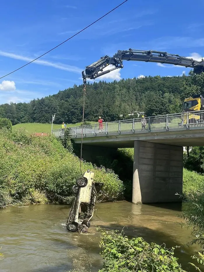 Einen mysteriösen "Fang" haben die Feuerwehr St. Paul und der Abschleppdienst Ellersdorfer am Wochenende gemacht. Ein gelber, mindestens schon 20 Jahre alter Pkw wurde geborgen. Wem das Fahrzeug mit den schwarzen Tafeln gehört und wie es in den Fluss kam, muss geklärt werden. Theorien gibt es vor Ort einige. Am wahrscheinlichsten dürfte sein, dass der Pkw während eines Hochwassers vor rund 25 Jahren oder gar vor noch längerer Zeit in den Fluss gespült wurde. Die Polizei ermittelt.
