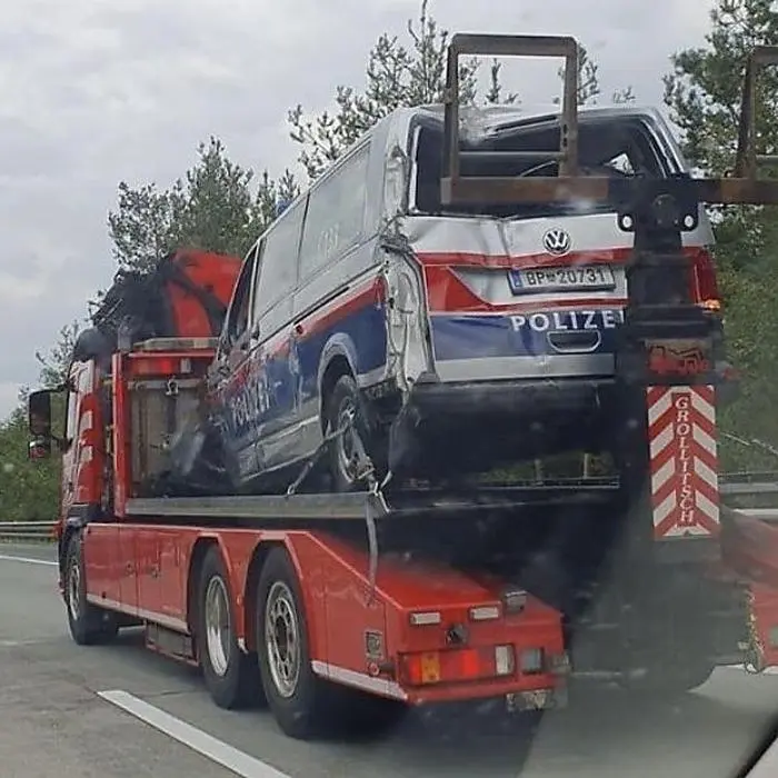 Ein 43-jähriger Polizeibeamter fuhr am Dienstag gegen 13.15 Uhr mit einem neun-sitzigen Polizeibus der SIG Kärnten auf der Südautobahn, A2, anlässlich einer von der Landesleitzentrale angeordneten Einsatzfahrt mit Blaulicht und Folgetonhorn, aus Villach kommend in Richtung Klagenfurt. "Auf Höhe Velden musste er auf der regennassen Fahrbahn das Fahrzeug auslenken, da ein Sattelschlepper über die Mittelleitlinie auf die Überholspur ausscherte. Dabei kam er ins Schleudern, verlor die Kontrolle über das Fahrzeug und schlitterte seitlich liegend 200 Meter auf der zweiten Fahrspur dahin und kam in weiterer Folge auf der Fahrerseite liegend zum Stillstand", heißt es im Polizeibericht.