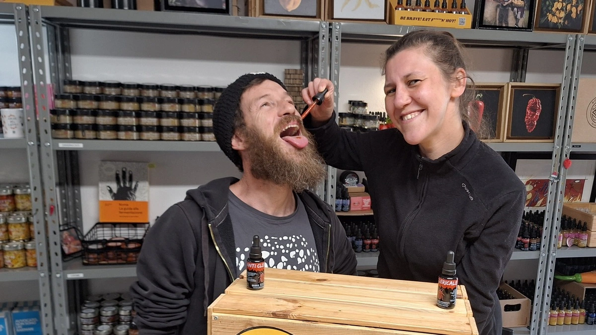 Filippo Bortolon und Sara Forgiarini in ihrem Chili-Geschäft in Gemona bei der Saucen-Verkostung