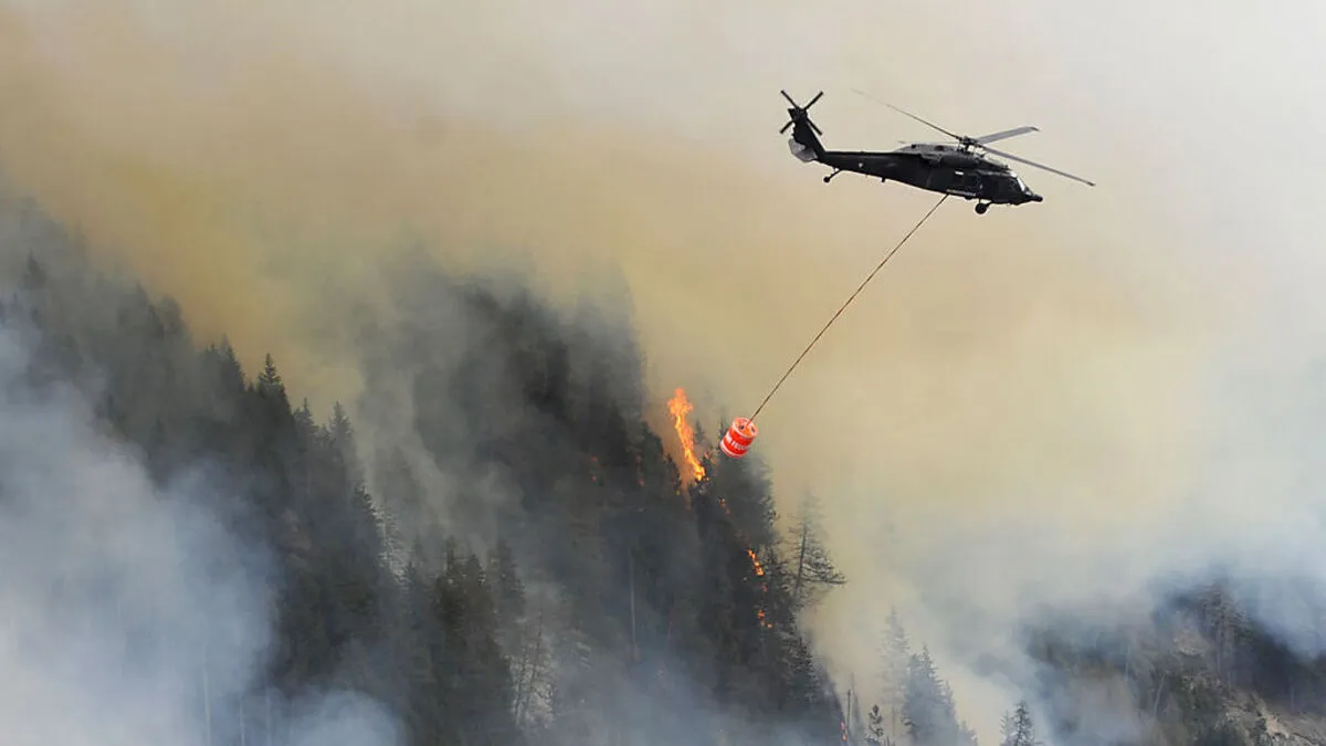 Hubschrauber fliegen Wasser auf den brennenden Berg