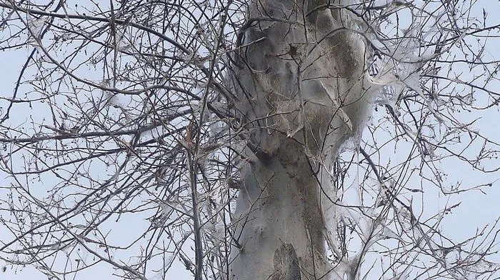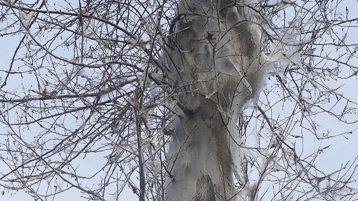 Wenn die Heckenkirschen-Gespinstmotte nach einer Massenvermehrung loslegt, dann wickelt sie Bäume ein und stellt staundende Betrachter vor ein großes Rätsel.