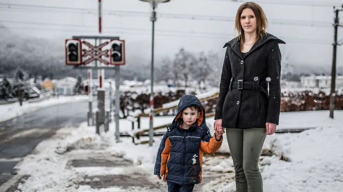 Lucas mit Mama Birgit Winkler vor dem Bahnübergang