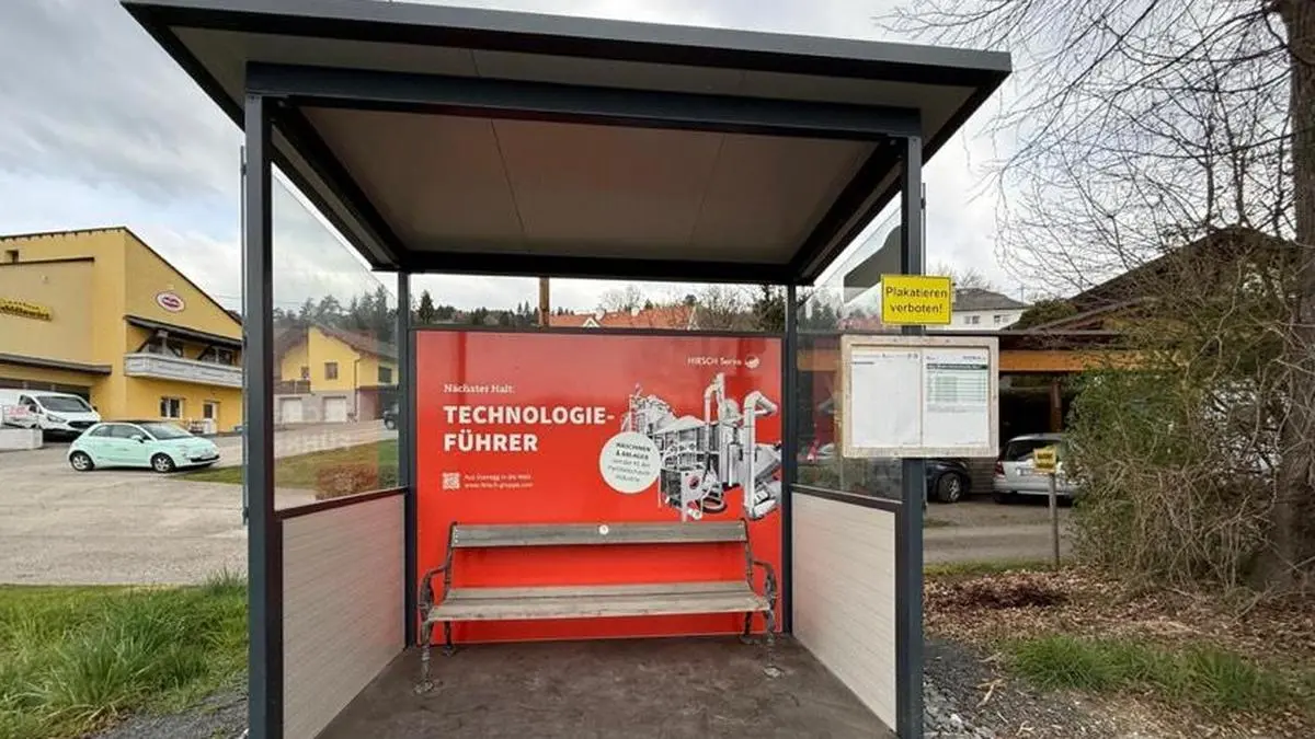 Die Glanegger Bushaltestellen werden erneuert. Eine in Kooperation mit Liebenfels. Firma Hirsch durfte ausnahmsweise bedrucken.