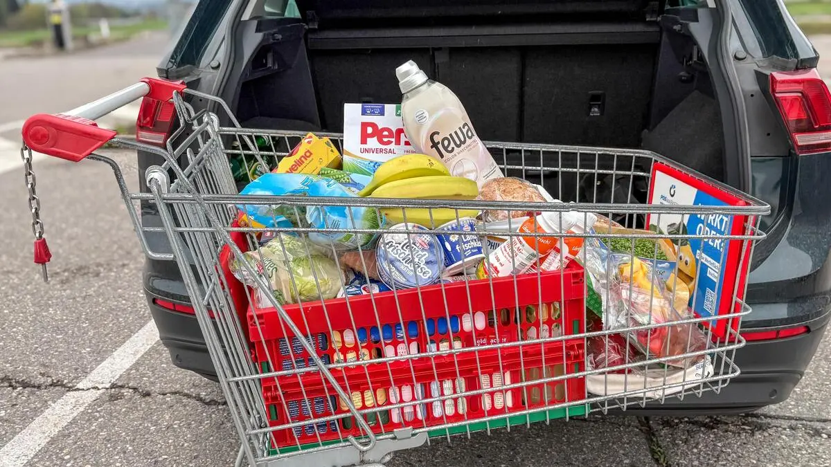 Ein prall gefüllter Einkaufswagen steht vor einem Auto, bei dem der Kofferraum geöffnet ist