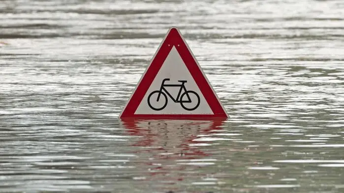 Ein Straßenschild, das fast komplett unter Wasser steht.