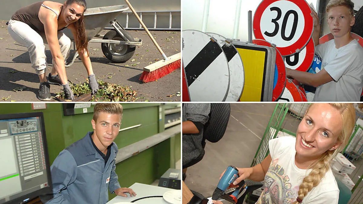Oben links: Achner räumt Hagelschäden auf; Unten links: Maier bei seiner Arbeit bei einem Schleifmittelerzeuger; Oben rechts: Riepl muss Verkehrszeichen instand setzen; Unten rechts: Schlintl sorgt für „Absätze“ bei "ara"