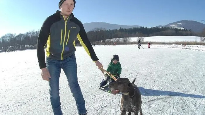 Die quadratische Eisfläche des Flatschacher Sees lädt zum Eislaufen – und