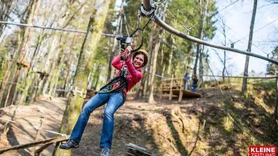 Kurzer Blick nach oben auf das Rollensystem der „Fly-Line“, Griff auf den Karabiner, der mich samt Sitzgurt an der Aufhängung hält. Passt, hält, ich vertraue. Wir sind unter den ersten, die durch den Kletterwald Ossiach schweben dürfen, Fotograf Markus Traussnig gleich mal rückwärts schwebend, weil fototechnisch nötig.