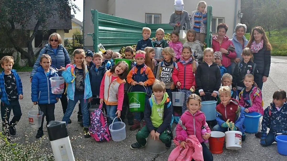Bei Aktion „Lass mich nicht hängen“ der Volksschule Glanegg retten die Schüler Äpfel, die ansonsten verfault wären. Daraus wurden fast 800 Liter Apfelsaft.