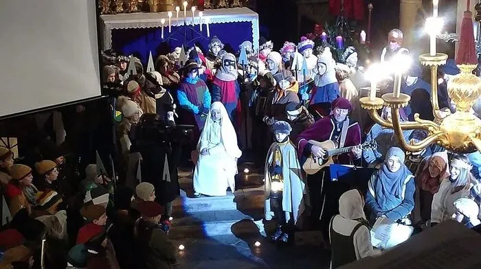 160 Kinder und Lehrer der Volksschule Liebenfels führten die biblische Herbergssuche auf der Burgruine in Pulst auf.