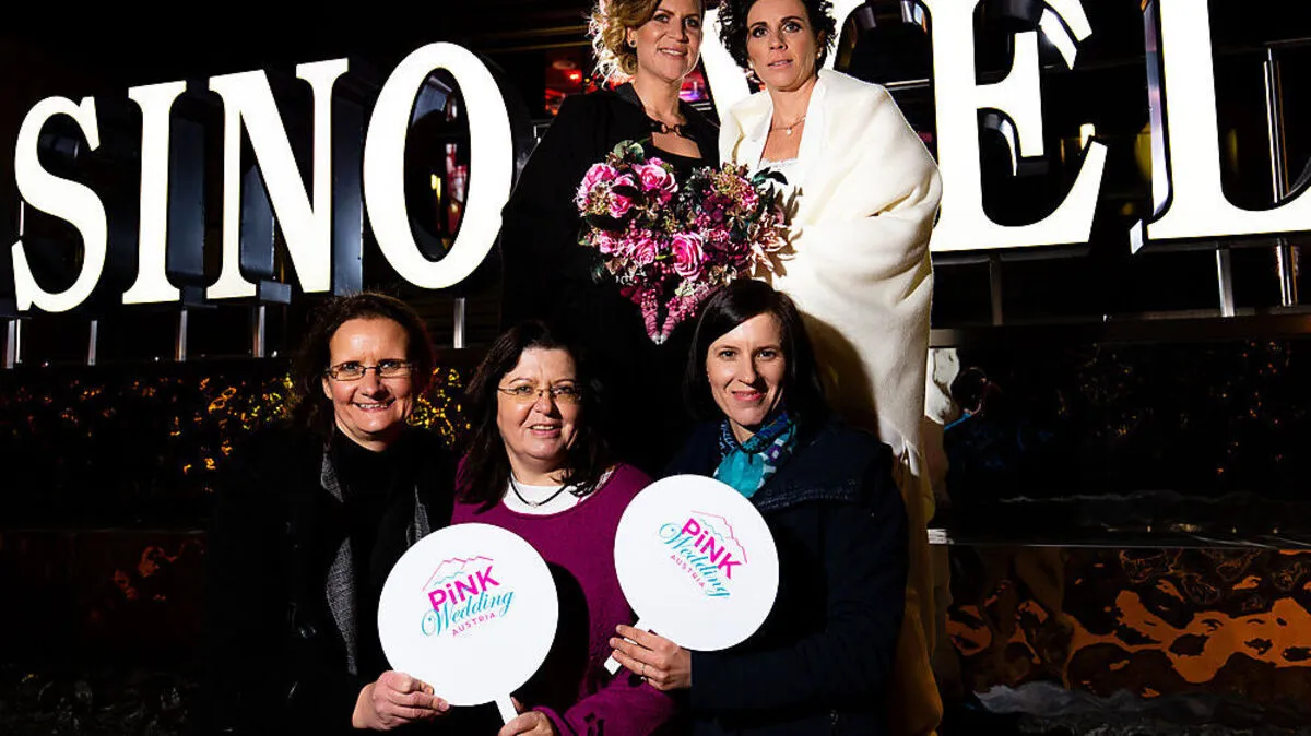 Andrea Dreger-Wicht, Sabine Gran und Alexandra Wagner (vorne, von links) organisierten die erste gleichgeschlechtliche Hochzeit von Daniela und Nicole Kopaunik