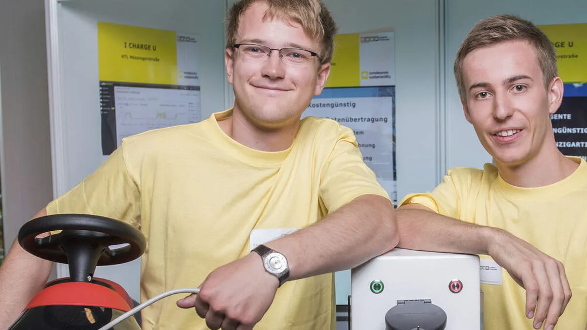 Florian Lederer (19) und Paul Stichaller (19) haben eine günstige Ladestation für Elektroautos konzipiert und wurden dafür ausgezeichnet.
