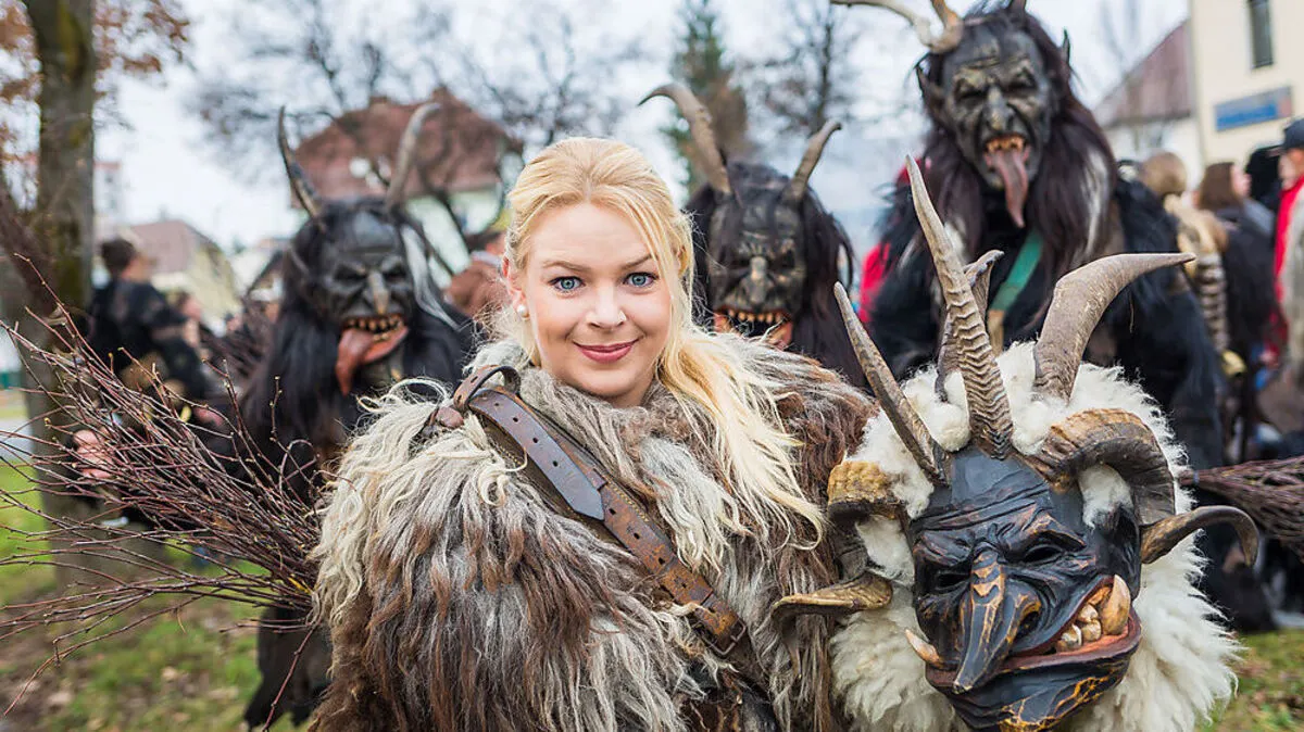 Marion Kleewein (25) ist eine von wenigen Kärntnerinnen, die sich unter einer gruseligen Perchtenmaske verstecken.