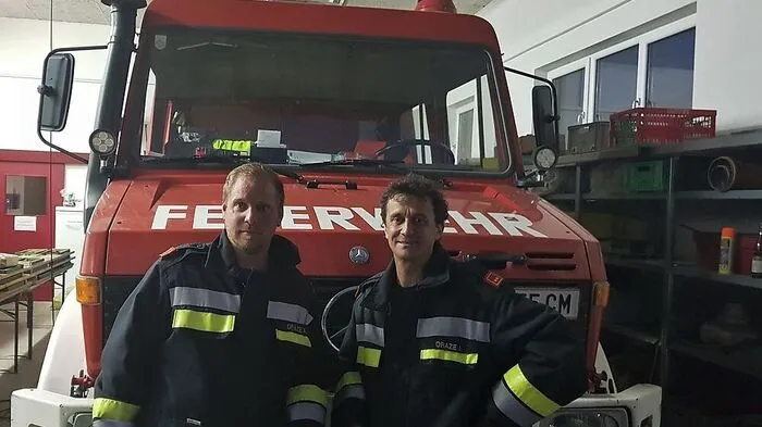Die Feuerwehrkommandanten Josef Oraže (51) und Armin Oraže (33) hoffen auf das endgültige "Brand aus" bei dem großen Waldbrand oberhalb von Zell-Freibach.
